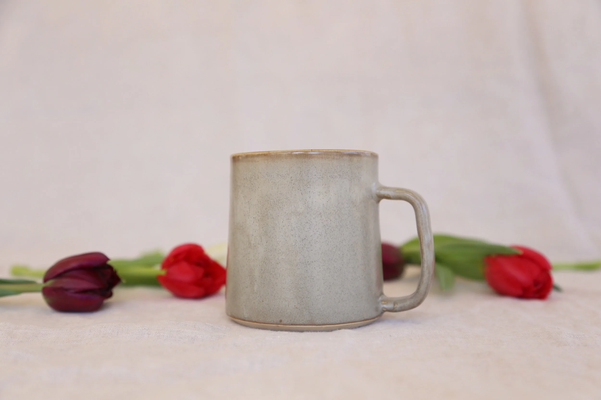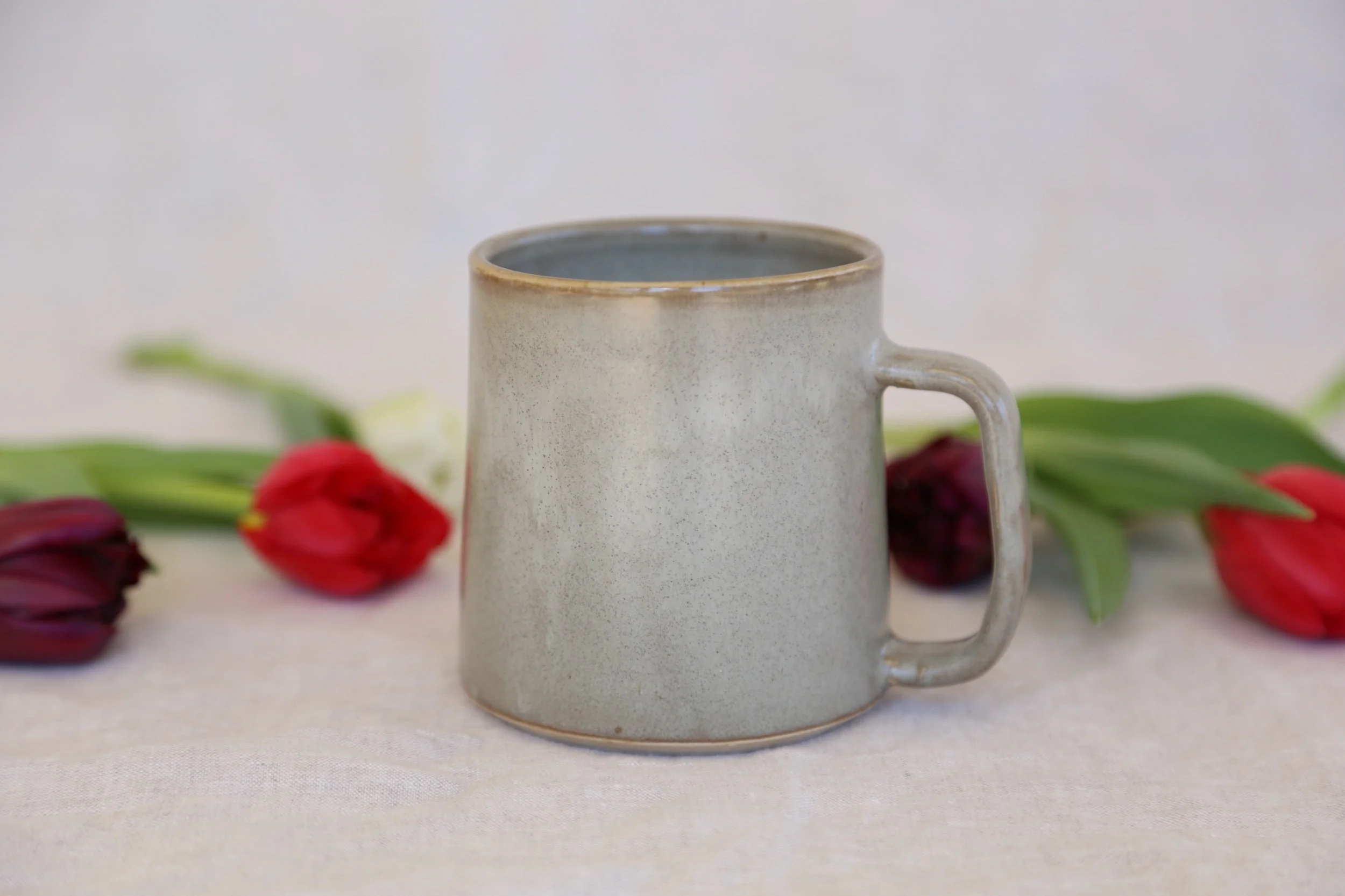 Our go-to mug in our newest gray glaze. We love the way it “breaks” over the edges. It holds around 12 ounces and is microwave and dishwasher safe