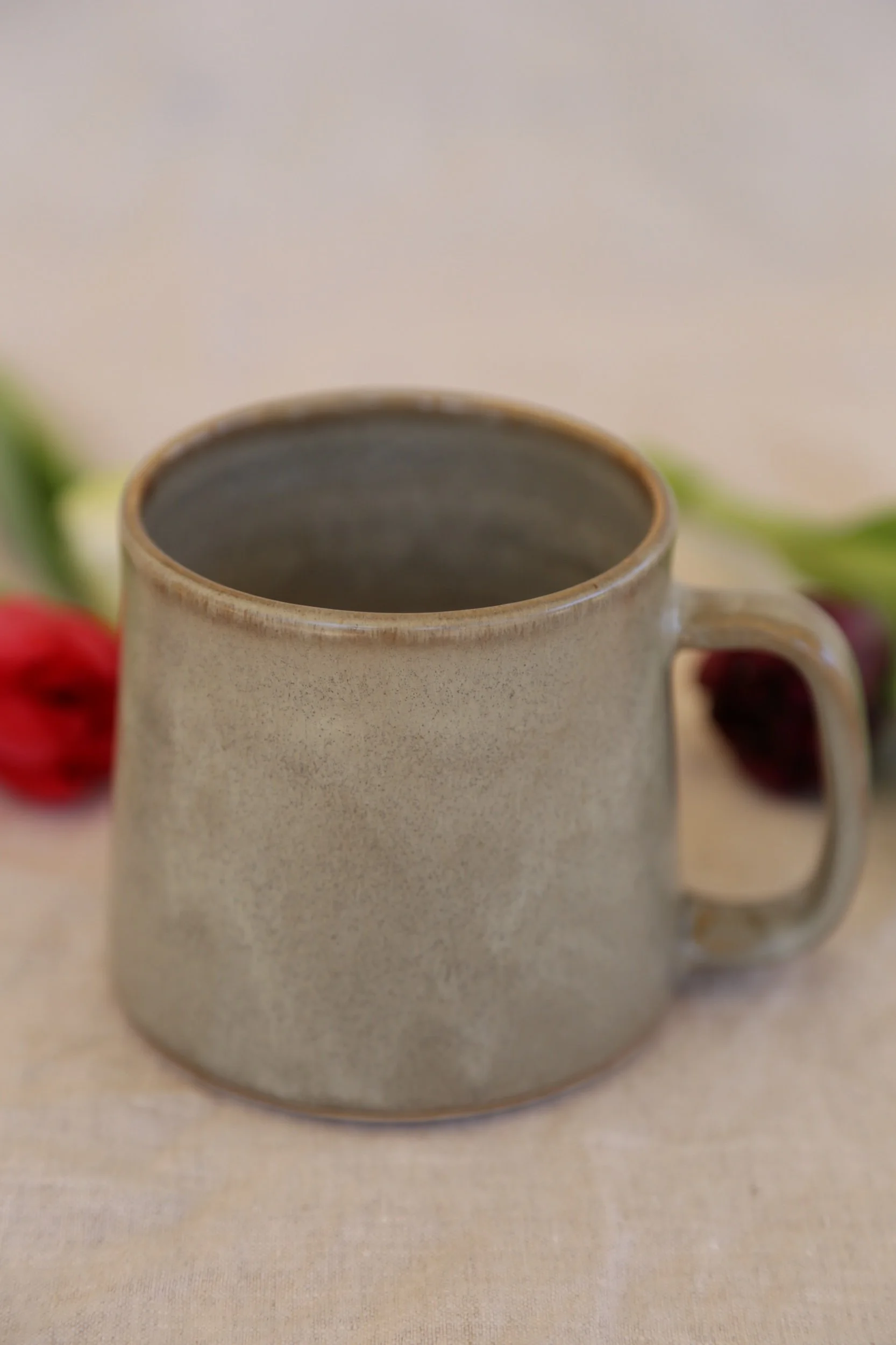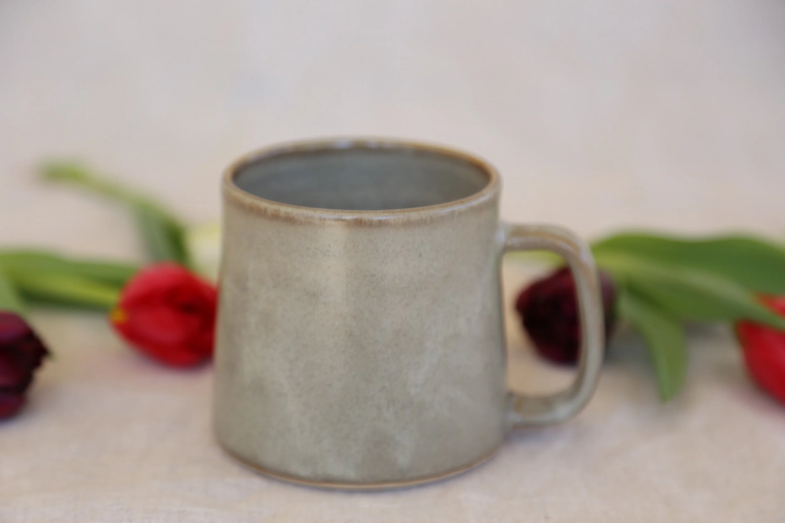 Our go-to mug in our newest gray glaze. We love the way it “breaks” over the edges. It holds around 12 ounces and is microwave and dishwasher safe