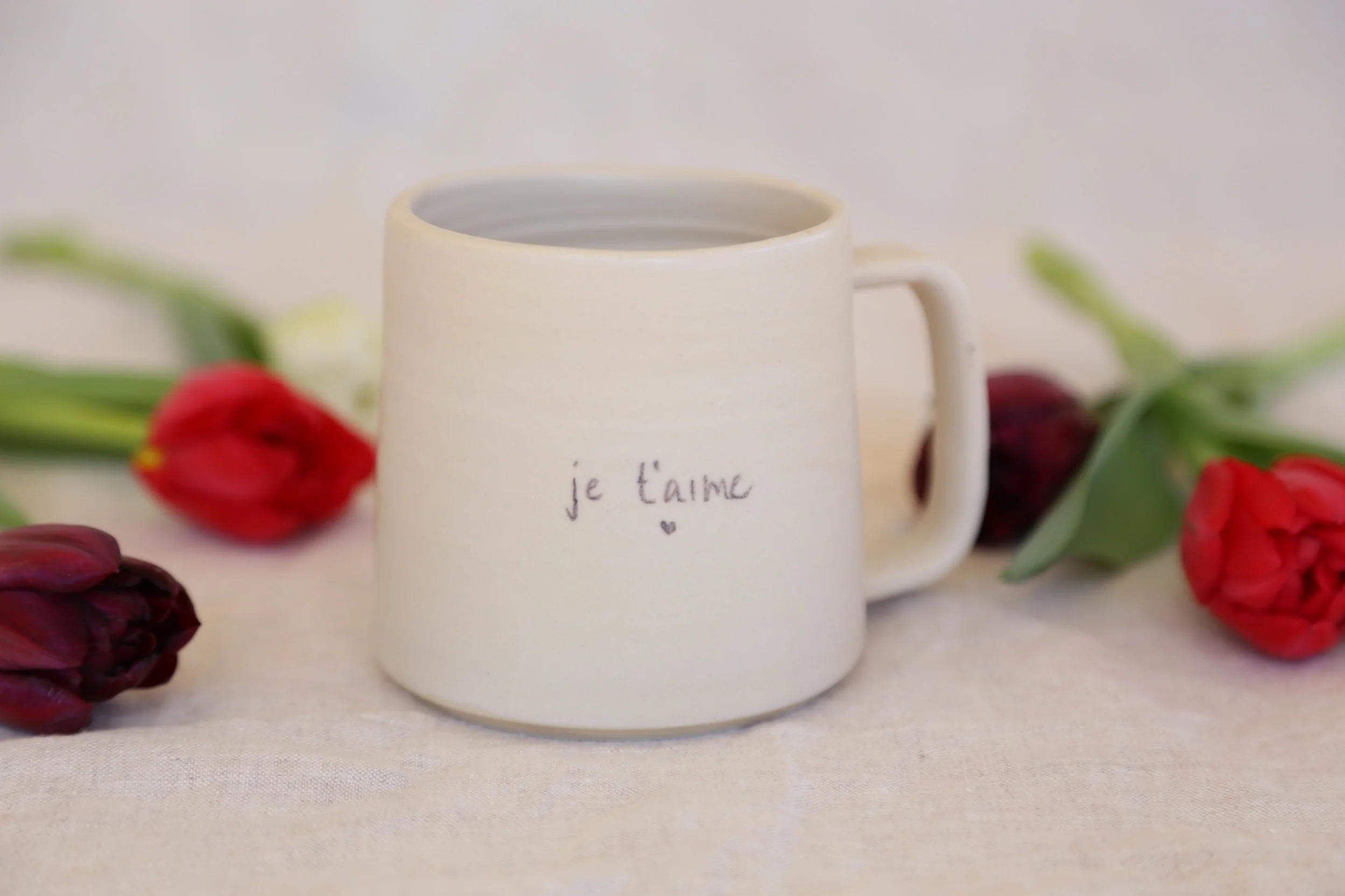 This mug is a one-of-a-kind mug we designed and drew. We wanted to create a special collection for Valentines Day this year and we know they’re not all on the nose with the theme, but they are all quite romantic if you ask us!