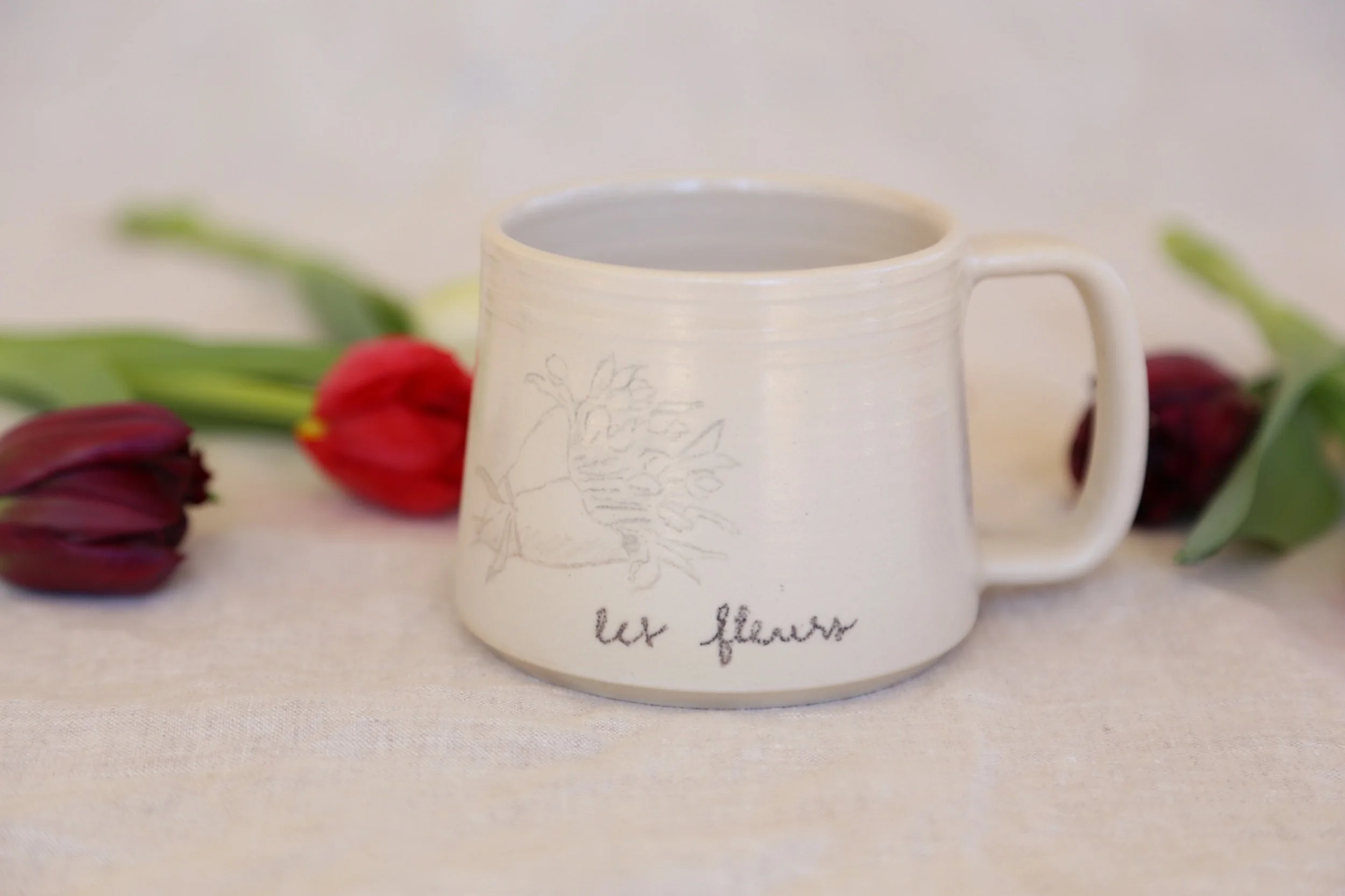 This mug is a one-of-a-kind mug we designed and drew. We wanted to create a special collection for Valentines Day this year and we know they’re not all on the nose with the theme, but they are all quite romantic if you ask us!